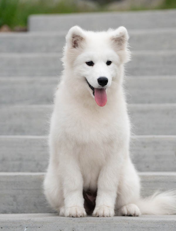 Мама щенков — Беатрис снежная рапсодия. Эта девочка дочь нашего Кости. Она достаточно крупная представительница породы, очень спортивная, мощный костяк, широкая грудная клетка.